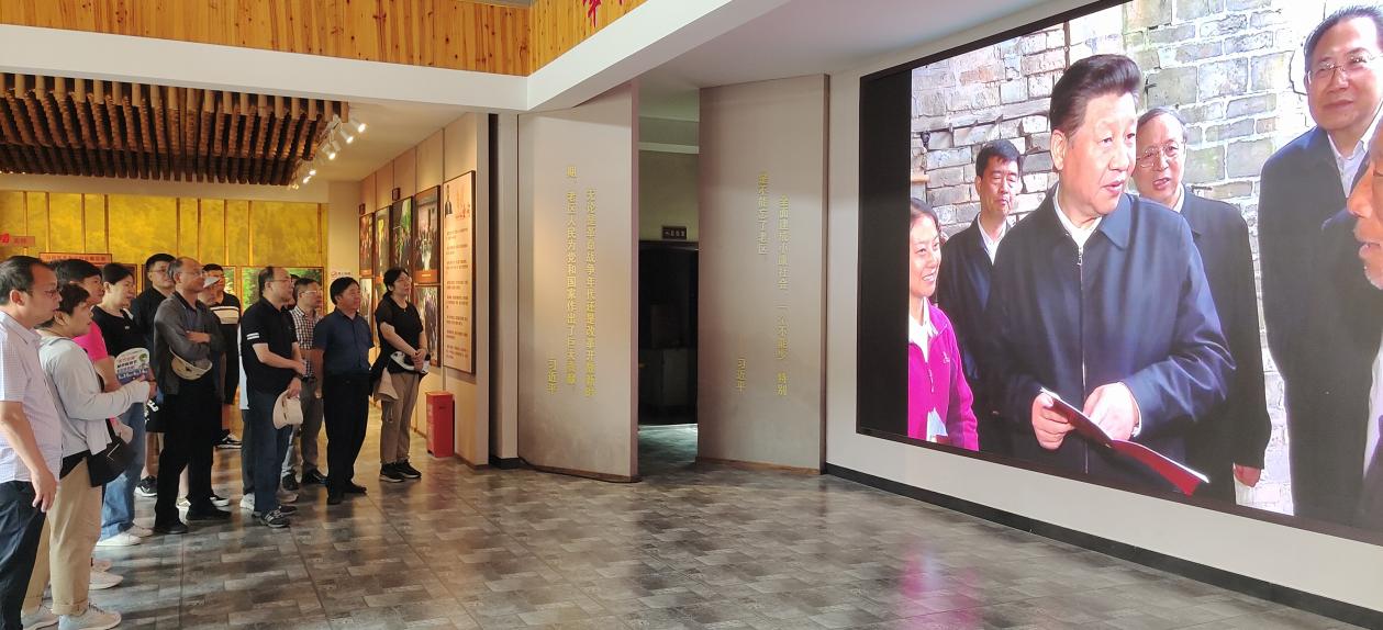 在大湾村,全体党员走访大湾村贫困农家旧貌,向老区人民奉献奋斗精神致敬,汲取其脱贫致富经验,共同观看习近平总书记考察六安的专题片。